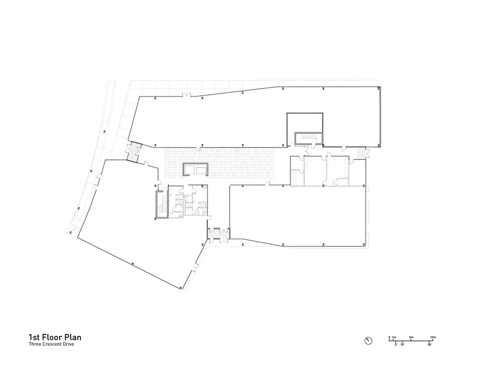 The north facade incorporates sun traps to reflect light into the building in the morning and evening when the sun is at a lower position in the sky. An exterior courtyard space acts as a refuge for employees and as a buffer between Three Crescent and future buildings along the Diagonal Boulevard.