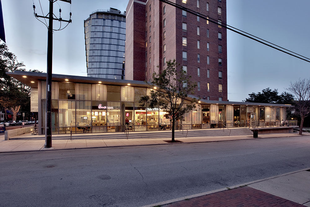 Located amongst a collegiate urban fabric the Northside Dining Terrace was designed to facilitate a pedestrian link for a community of students as well as providing a welcome change from the typical college dining experience, establishing a more intimate and less institutional setting.