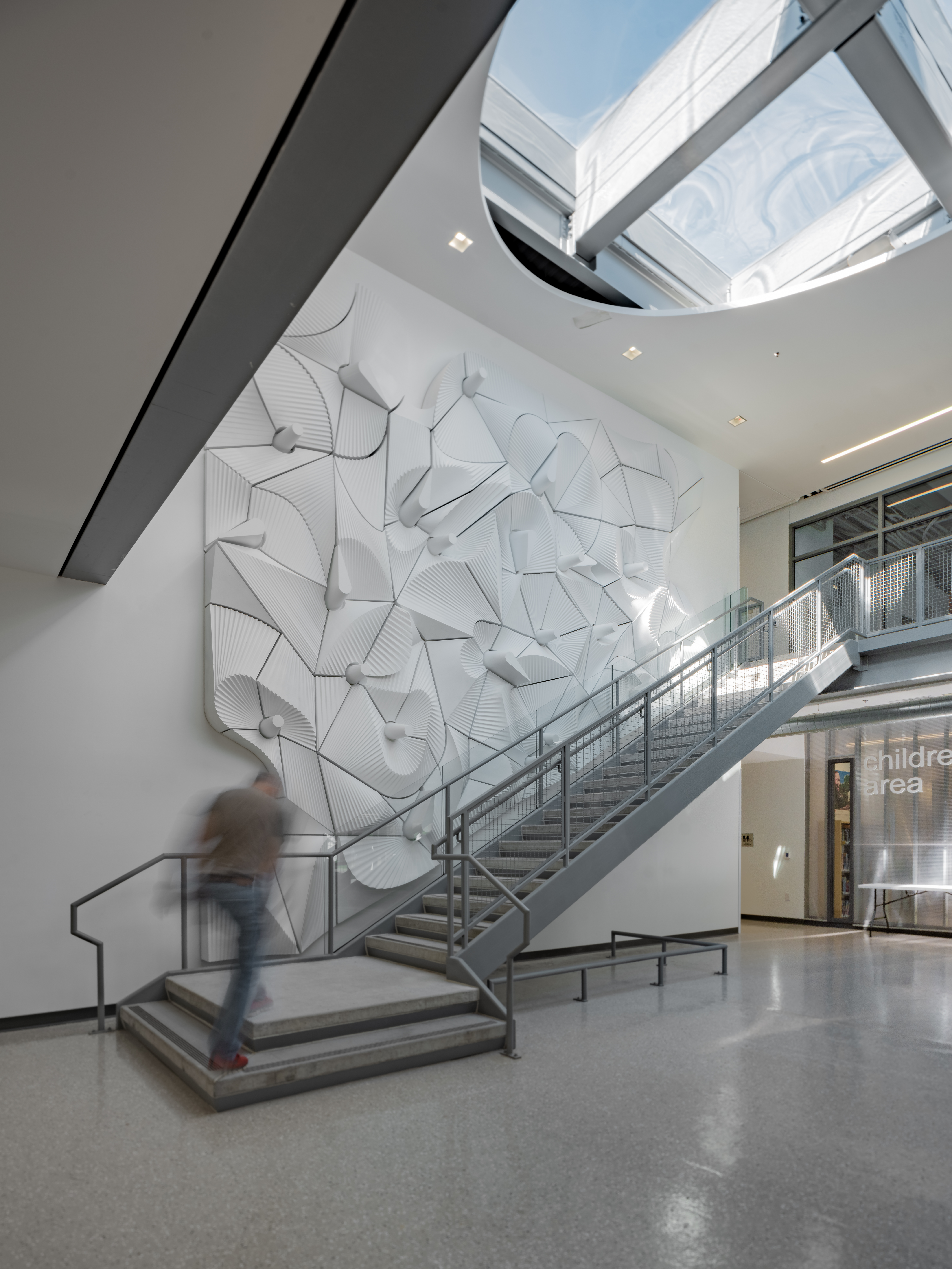 The central gathering space will display a 2-story digitally fabricated sculpture created by Penn's Robotics Lab at the Weitzman School of Design. The sculpture will be on permanent exhibit at the community center as an outreach ambassador for the University of Pennsylvania and will be an example for young students to see the technical and artful outcomes for careers in digital technologies.