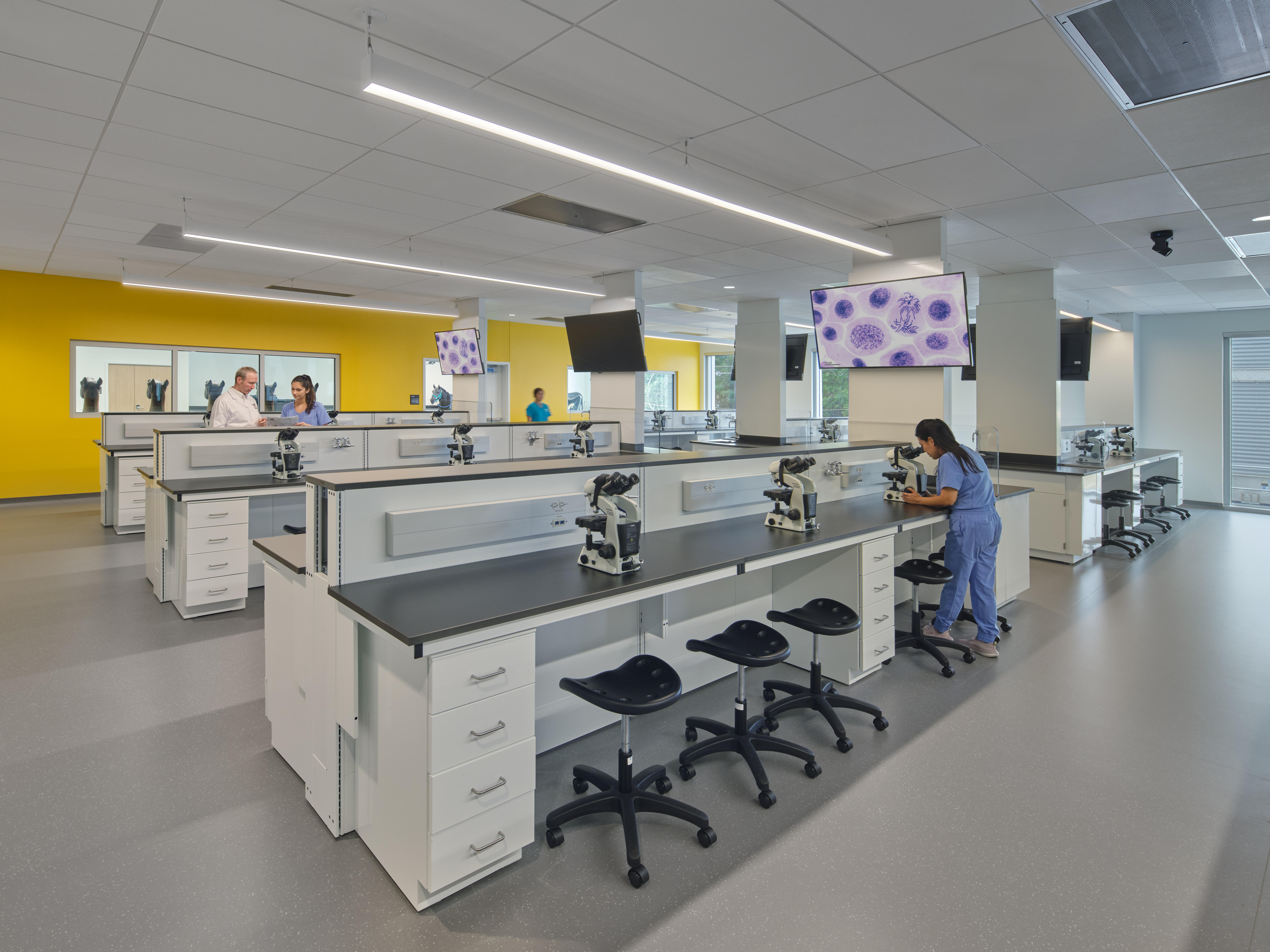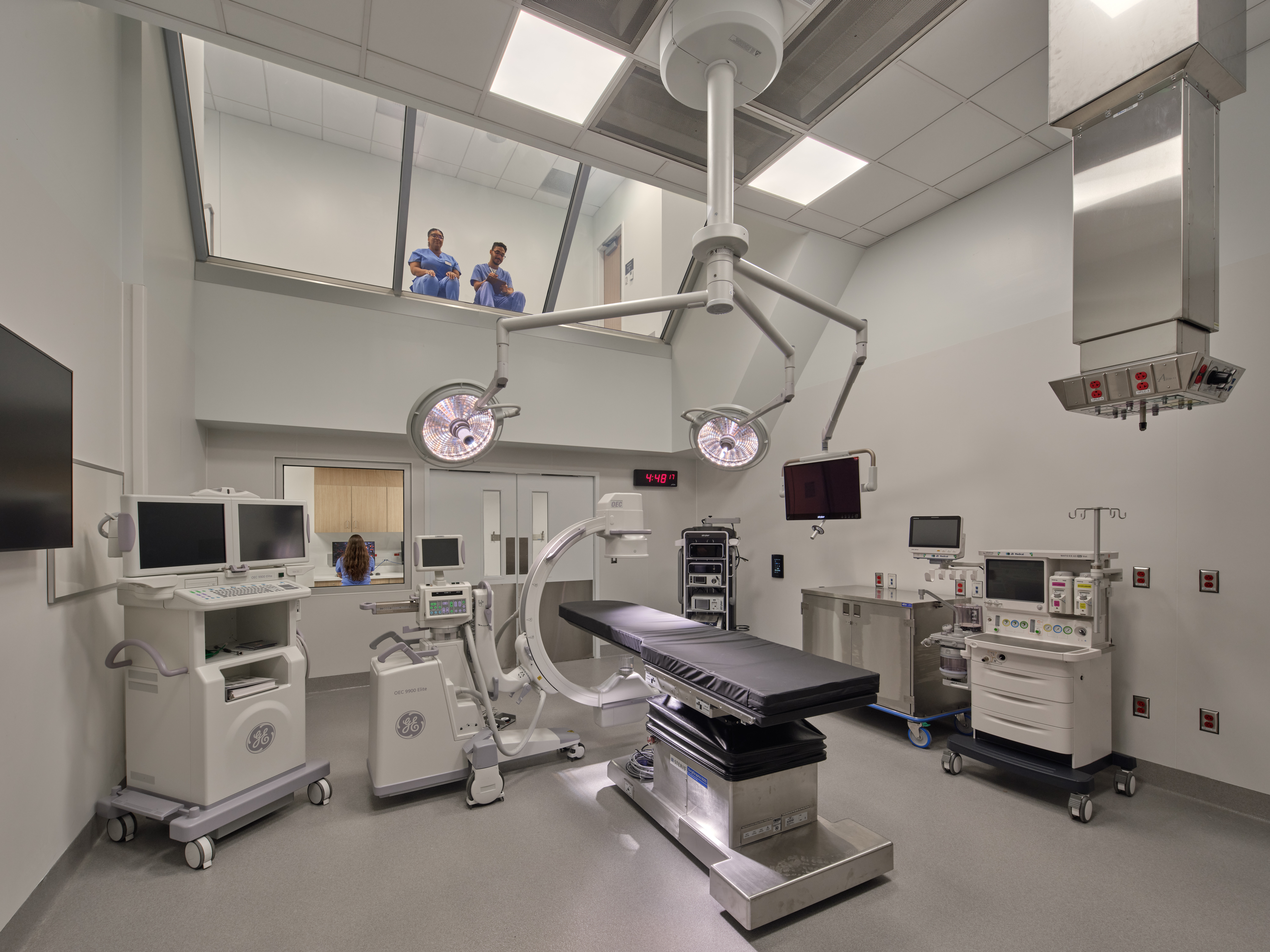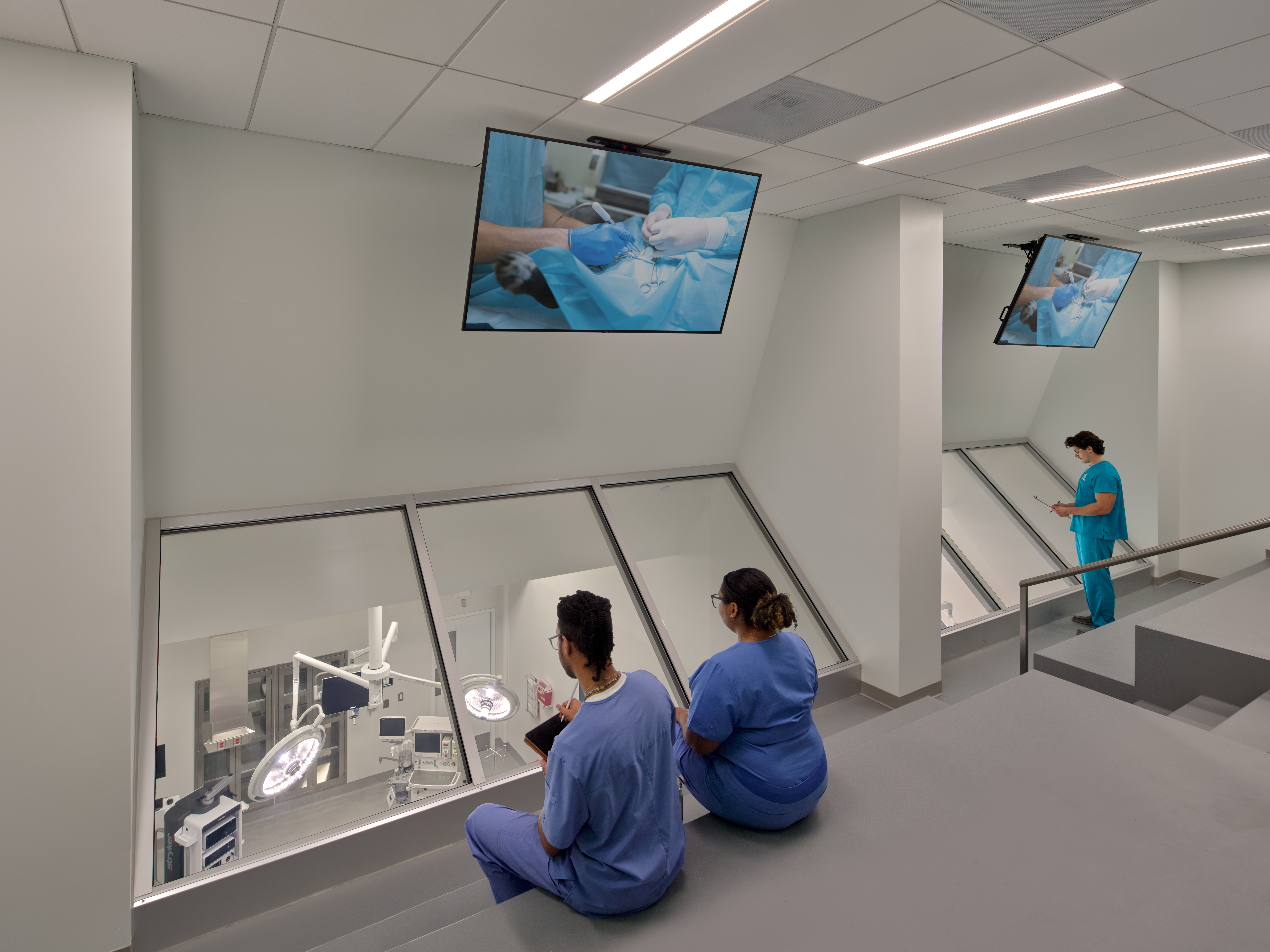 The design centers on a dynamic, collaborative learning environment tailored for experiential education. Flexible teaching spaces, high-tech auditoriums, and advanced labs are complemented by an open surgery gallery where students can witness real-world applications of their studies. Led by Erdy McHenry, the planning process adeptly balanced space and budget constraints while navigating an accelerated construction schedule. Innovative solutions were incorporated to enhance functionality, streamline workflows, and support program development, seamlessly blending traditional “teaching hospital” frameworks with modern educational needs.