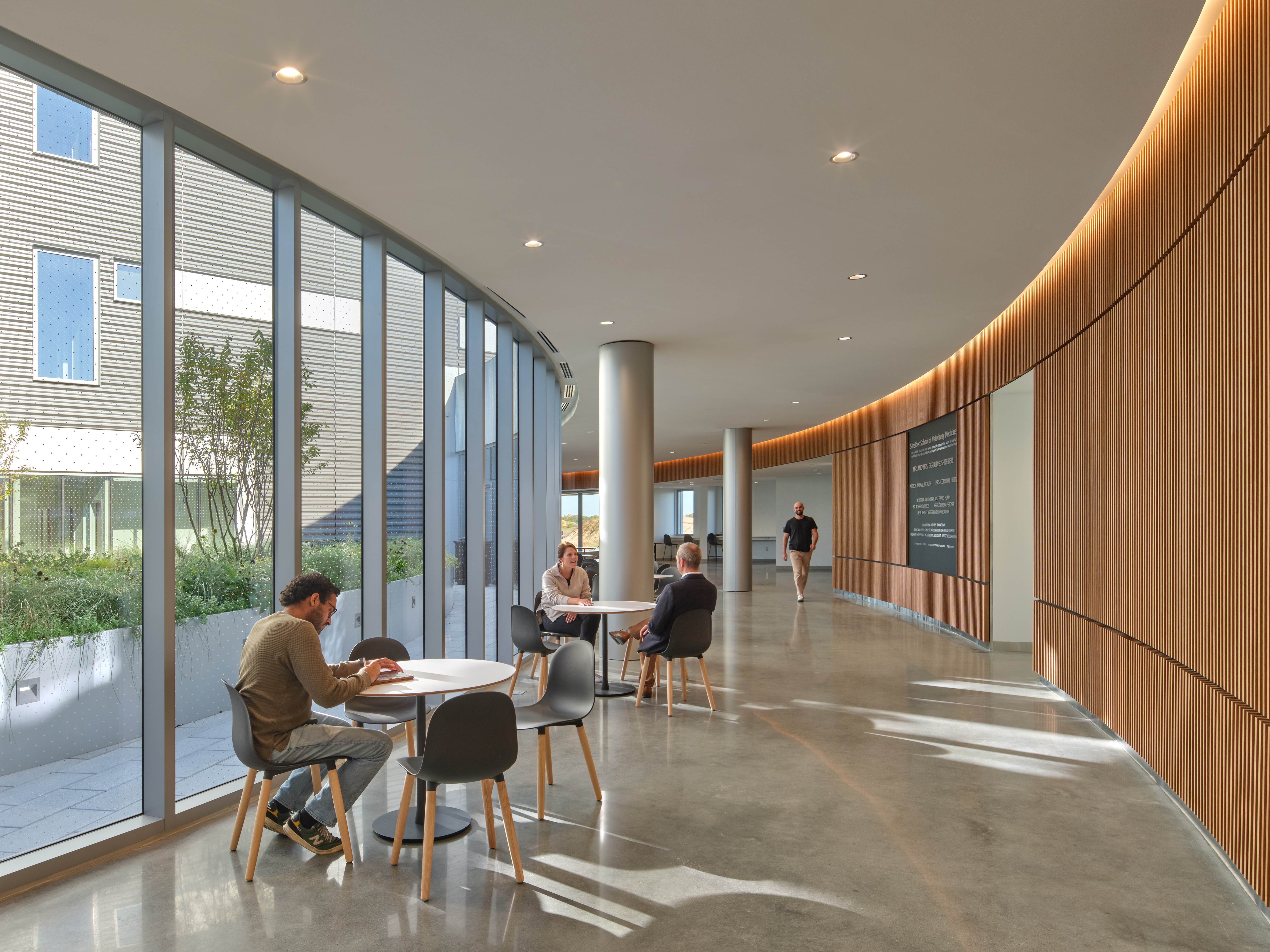 Throughout the facility, thoughtful design enhances both function and experience. Perimeter collaboration alcoves, positioned to offer restorative views of the natural landscape, provide spaces for students and staff to recharge and connect. Carefully planned circulation paths—including separate entrances and dedicated pathways for distinct user groups—improve traffic flow while enhancing user comfort. From the highway, the facility’s striking entry sequence signals its identity, creating a welcoming and recognizable presence that reflects Rowan’s commitment to excellence in veterinary science.