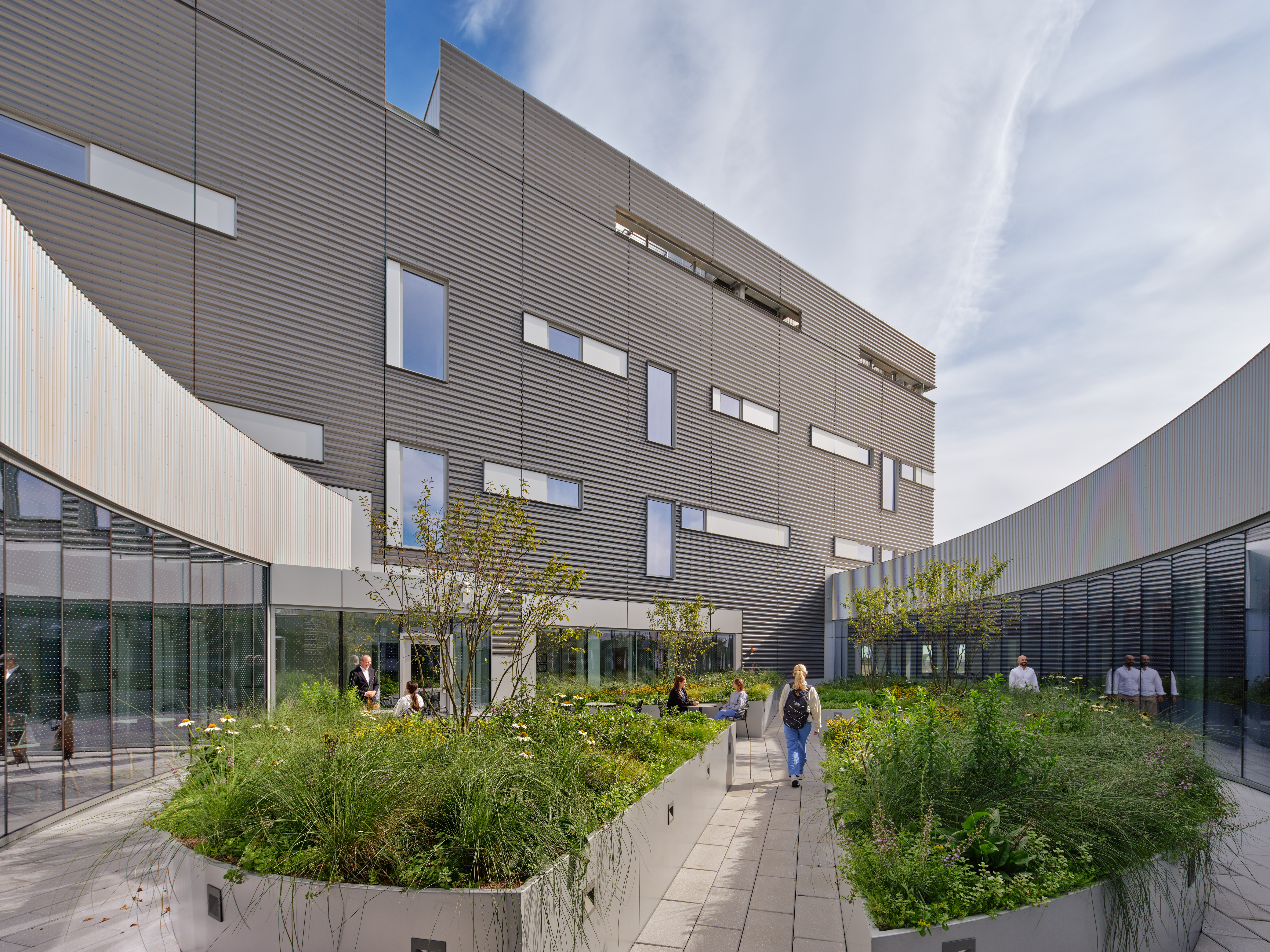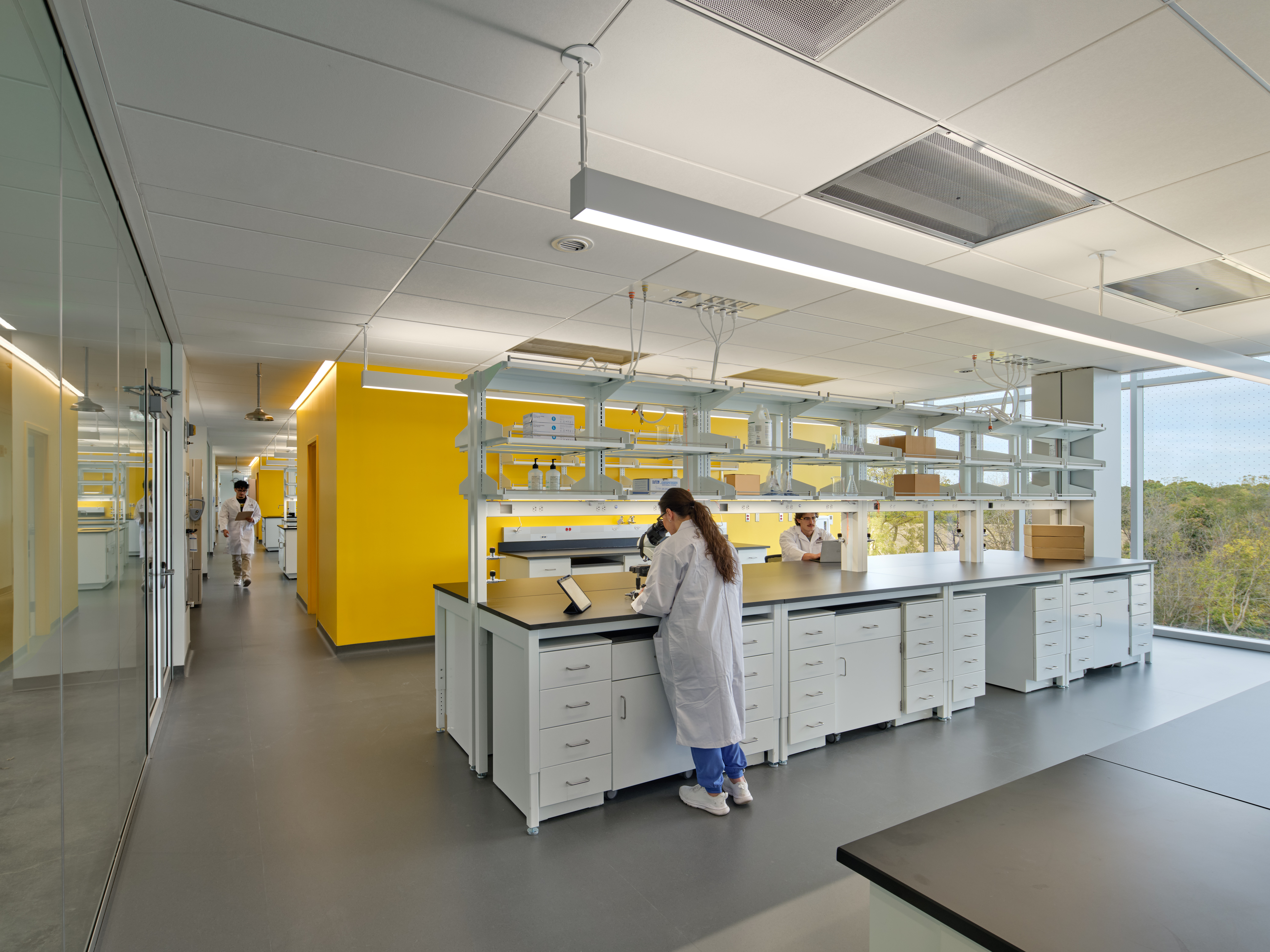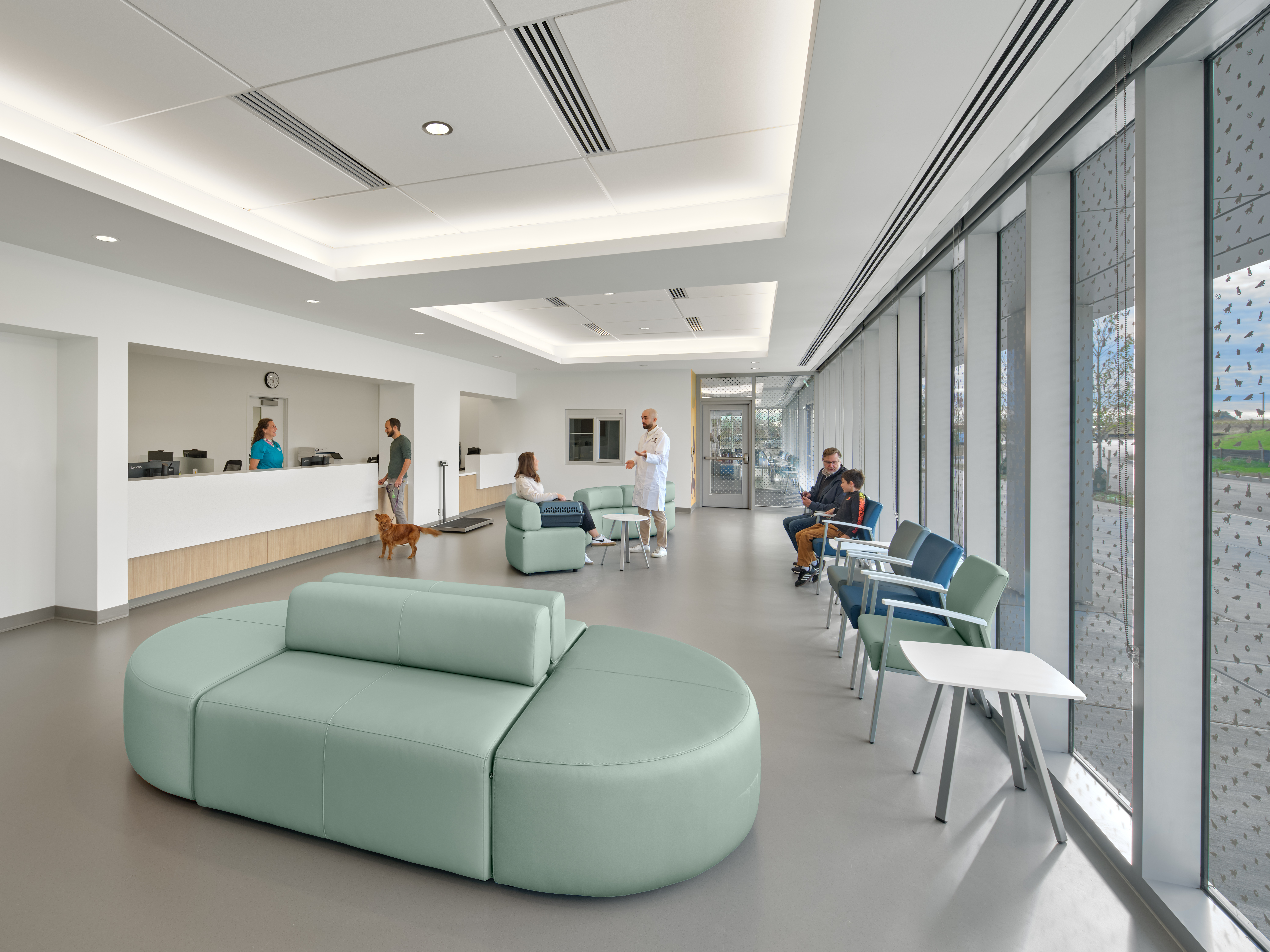 Future adaptability is a cornerstone of the facility’s design. Clinical, wet and dry labs, and research spaces are configured to evolve as needs change, while enclosed support areas and open workspaces provide flexibility for shifting demands. A standout feature is the open-format surgery gallery, equipped with overhead monitors, which invites students to observe procedures up close, bridging the gap between scientific discovery and clinical application in a true ‘bench-to-bedside’ fashion. At the heart of the facility is the veterinary hospital, which specializes in companion animal care while partnering with affiliated institutions for large-animal clinical rotations. It features a Community Practice department with a dedicated outpatient waiting area and specialized services in oncology, ophthalmology, dermatology, cardiology, and exotic animal care.