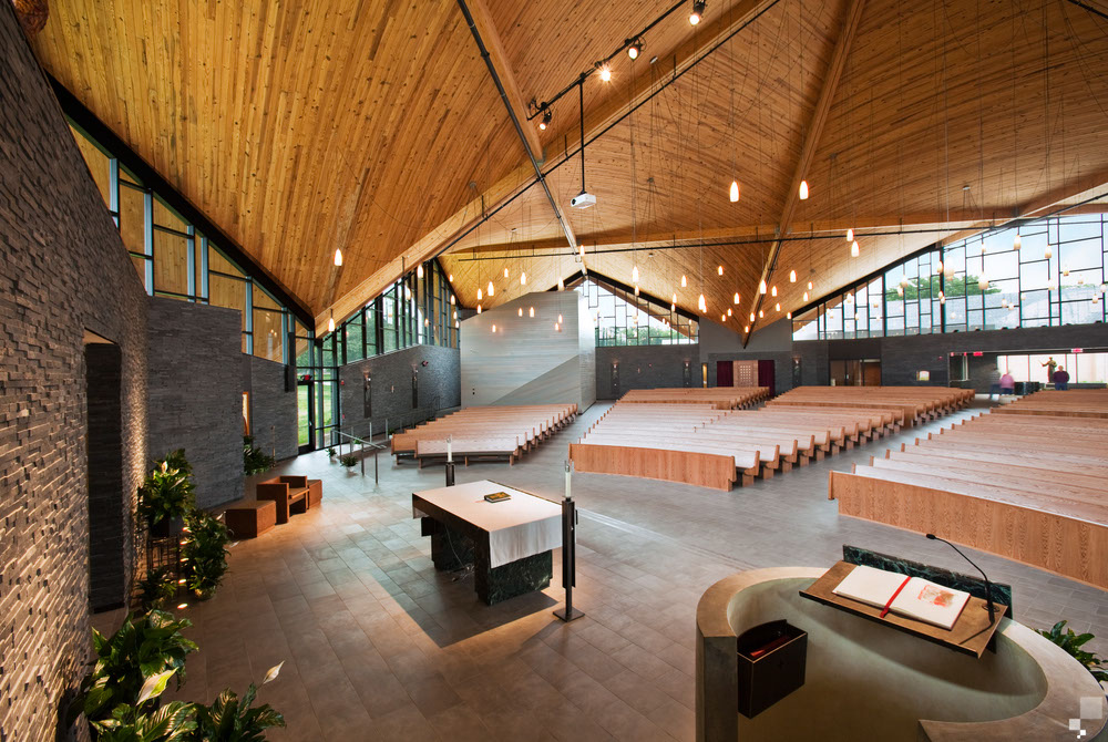 The new Church of Saint Aloysius tells the story of its purpose through its architectural expression. Two significant conceptual explorations gave form to the design for this church: “re-pitching the tent”, expressed in the delicate soaring roof lines evoking the concept of simple worship and the Four Devotions of Saint Aloysius: Blessed Sacrament, Passion of Our Lord, Love of Our Lady, and Choir of Angels, which sit within the church adjacent to the large concrete buttresses anchoring the roof.